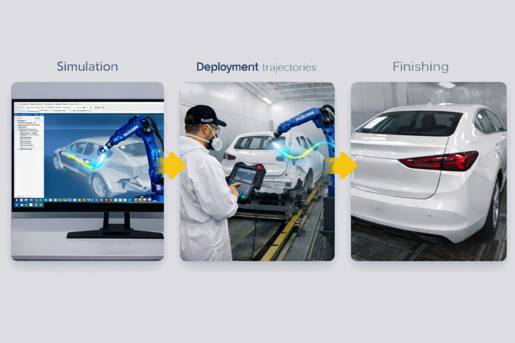 RobXP accompagne vos projets de robotique peinture industrielle depuis la simulation hors ligne (PHL) jusqu’à la mise en service en production.